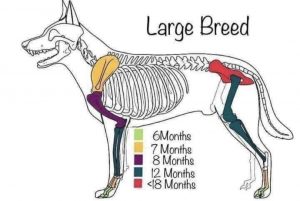 Las razas grandes van desde el nacimiento hasta las 20 semanas (Hawthorne et al 2004). El ejercicio excesivo y una nutrición inadecuada durante estos periodos pueden conducir a la conformación y malformación de los huesos, lo que puede conducir al desarrollo de osteoartritis y a la enfermedad degenerativa de las articulaciones.